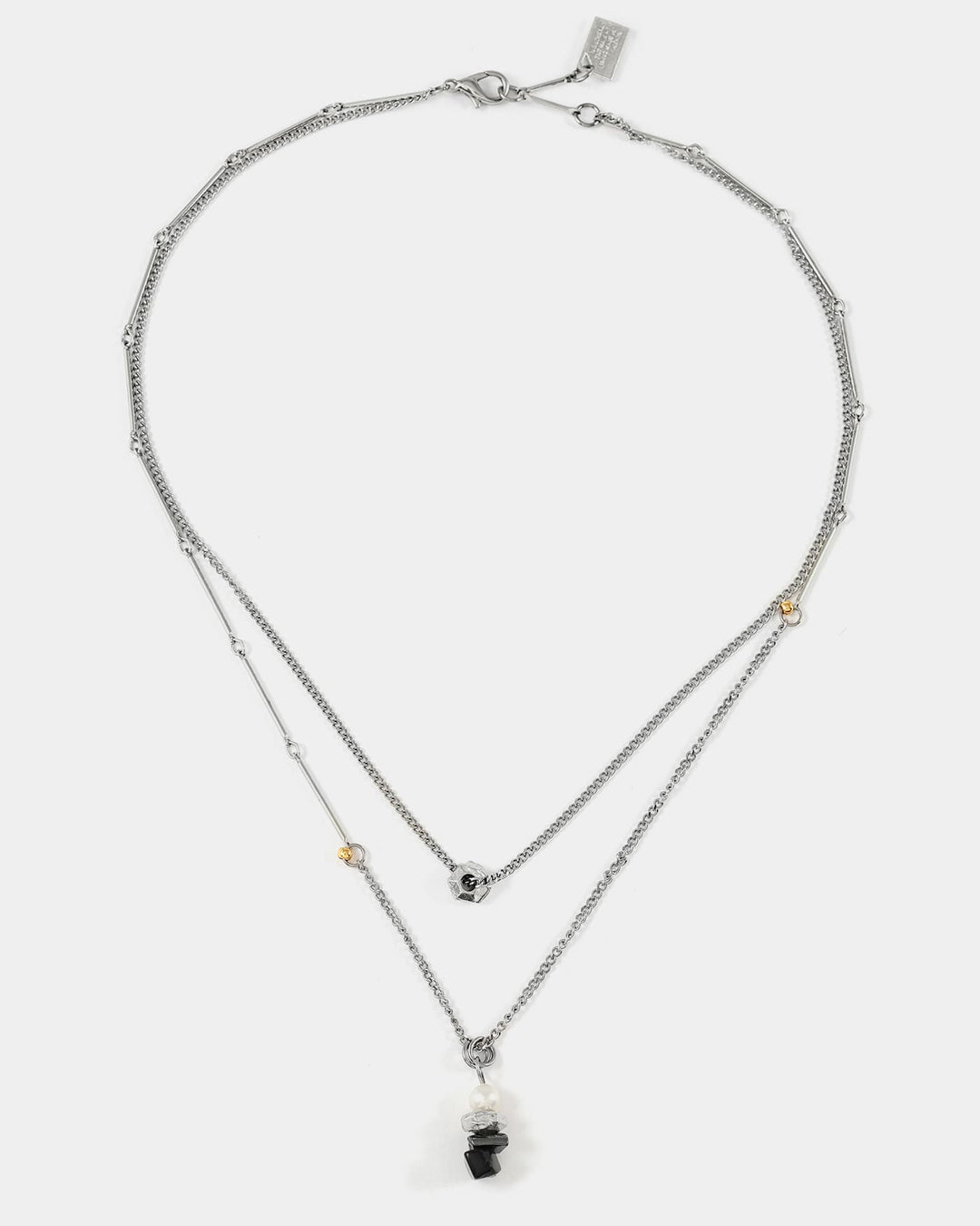 L’onyx noir, l’agate translucide, le jaspe moucheté, la perle d’eau douce – autant de pierres naturelles qui s’entrelacent avec des pépites d’étain naturel ou plaqué or 22 caratsé Monté sur des chaînes en acier inoxydable, chaque élément semble suspendu dans l’espace, formant une constellation précieuse. Plus qu’un bijou, Caelus est un rituel : celui de s’ancrer tout en s’élevant.