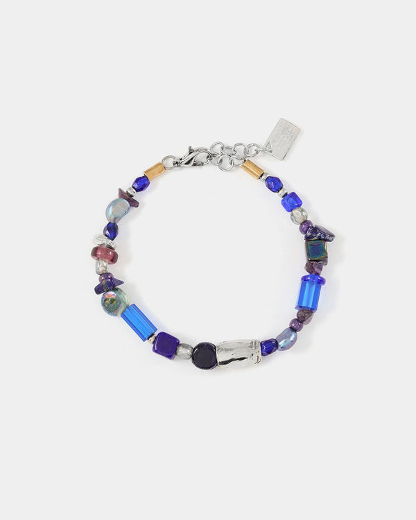 Ce bracelet enfilé délicat associe des billes colorées aux formes organiques, des perles d’eau douce et des pièces en étain naturel ou plaqué or 22 carats, créant un jeu de contrastes et de textures raffinées. Son design fluide capte la lumière et illumine le poignet d’un éclat moderne, parfait pour celles et ceux en quête d’une pièce vibrante.