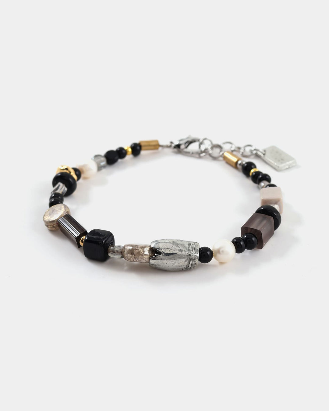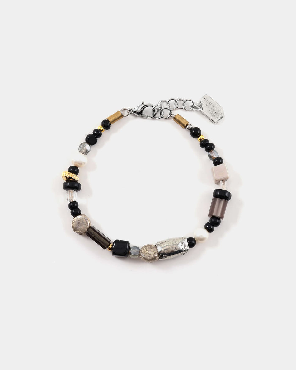 Ce bracelet enfilé délicat associe des billes colorées aux formes organiques, des perles d’eau douce et des pièces en étain naturel ou plaqué or 22 carats, créant un jeu de contrastes et de textures raffinées. Son design fluide capte la lumière et illumine le poignet d’un éclat moderne, parfait pour celles et ceux en quête d’une pièce vibrante.