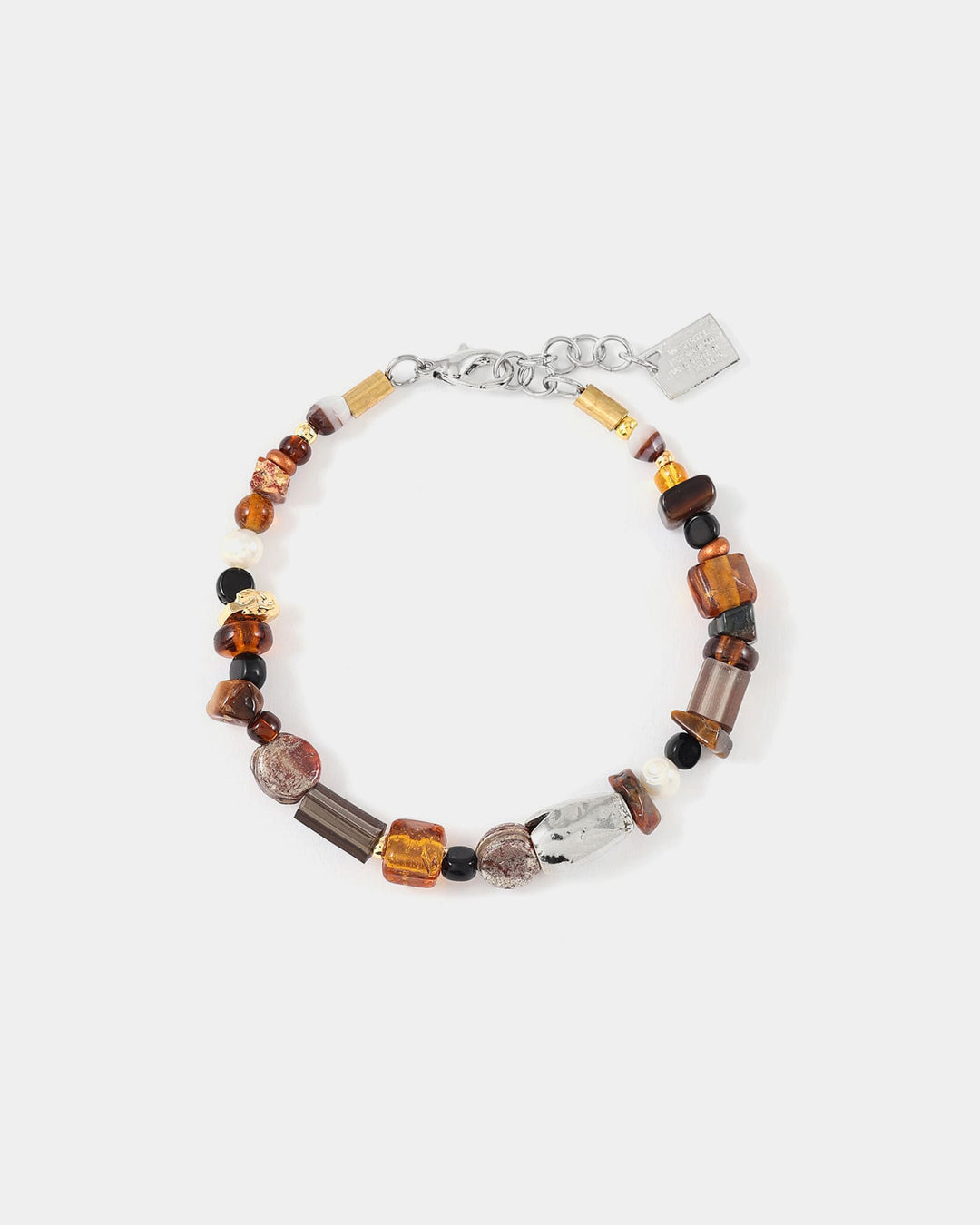 Ce bracelet enfilé délicat associe des billes colorées aux formes organiques, des perles d’eau douce et des pièces en étain naturel ou plaqué or 22 carats, créant un jeu de contrastes et de textures raffinées. Son design fluide capte la lumière et illumine le poignet d’un éclat moderne, parfait pour celles et ceux en quête d’une pièce vibrante.