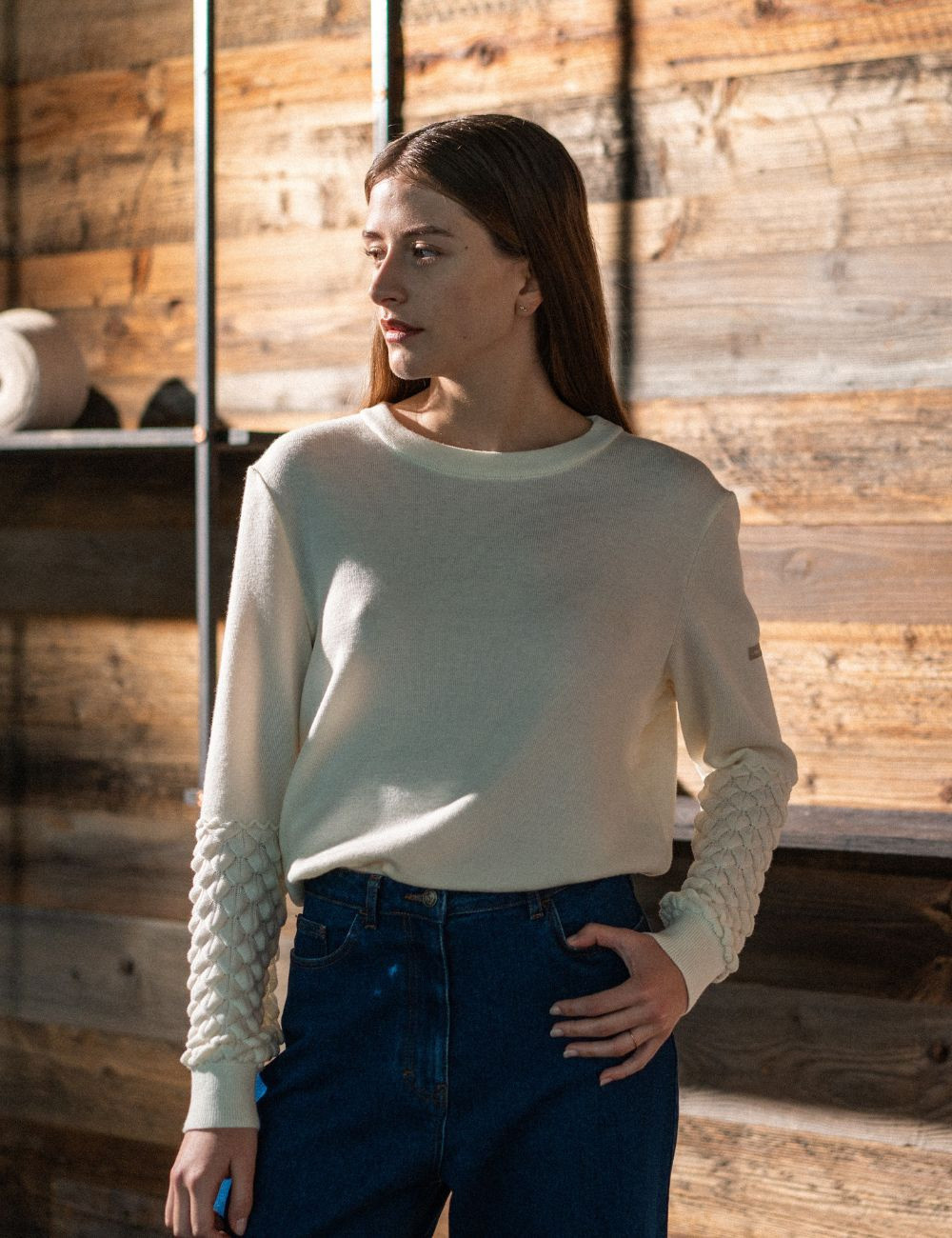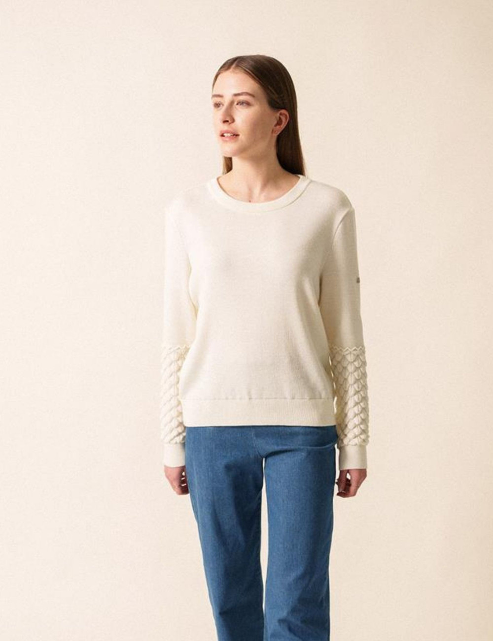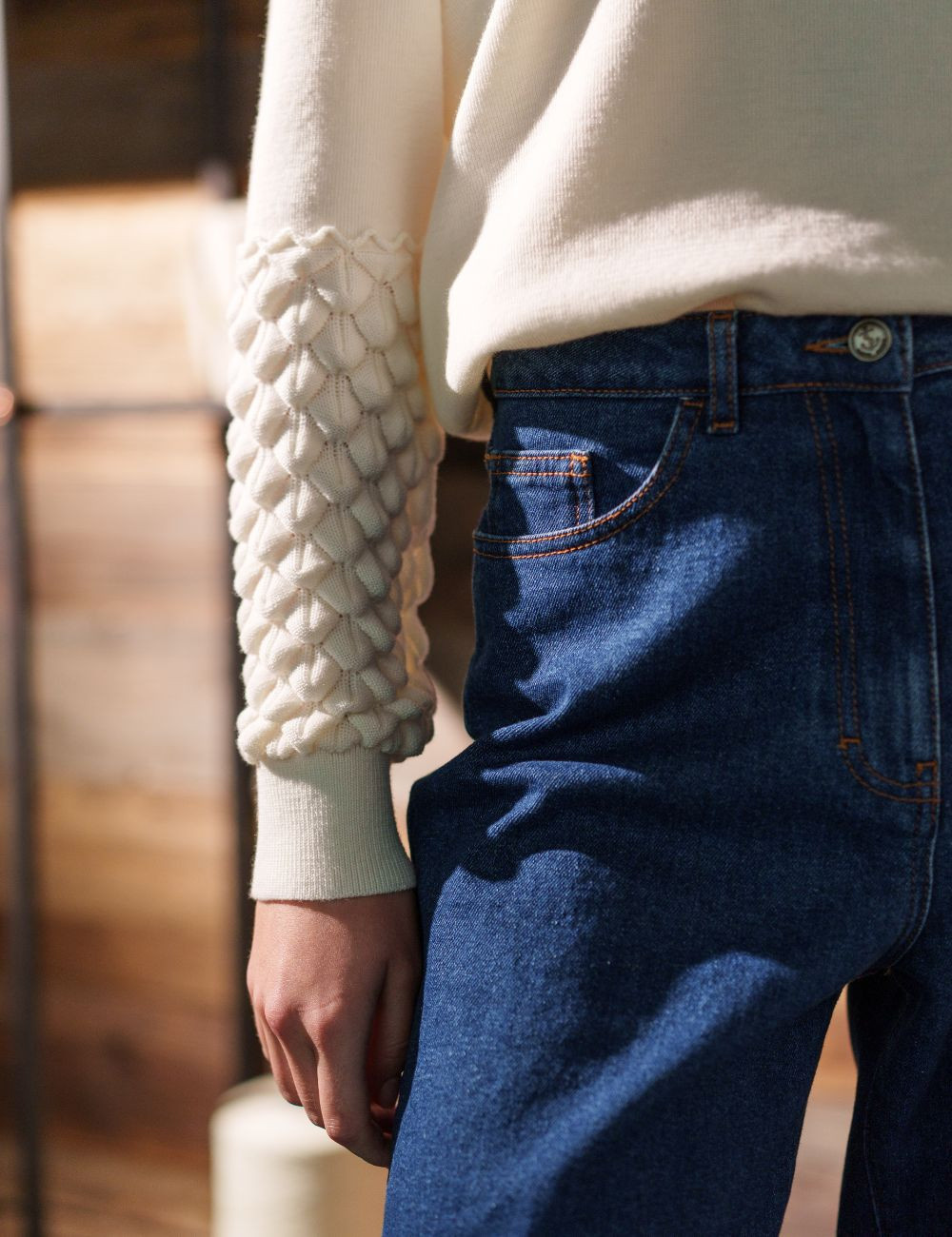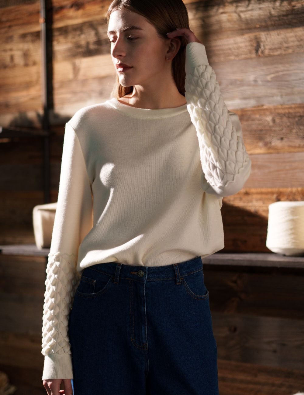 Ce jersey de laine présente une encolure remaillée impeccablement finie et des bords-côtes aux poignets et à l'ourlet pour une coupe structurée et flatteuse. Son détail phare ? Ses manches sculptées, ornées d'un motif en relief texturé, apportent la touche d'originalité et de féminité idéale.
