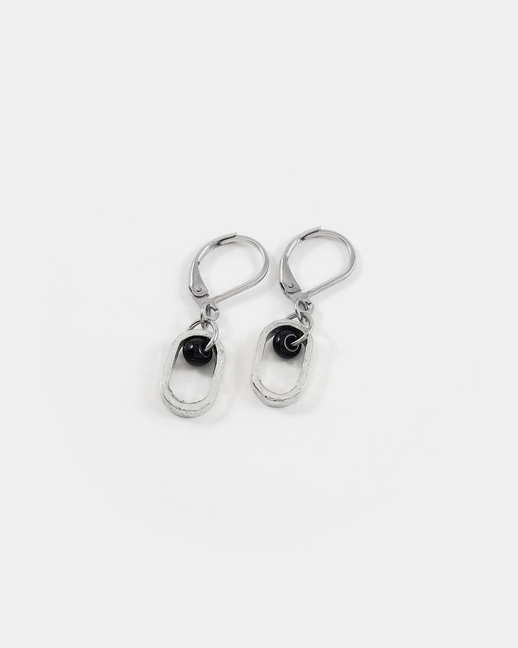 Un maillon ovale en étain naturel ou plaqué or 22 carats encadre un grain de verre coloré suspendu en son centre. Un jeu de contraste tout en retenue, pour une touche de couleur qui résonne avec précision.