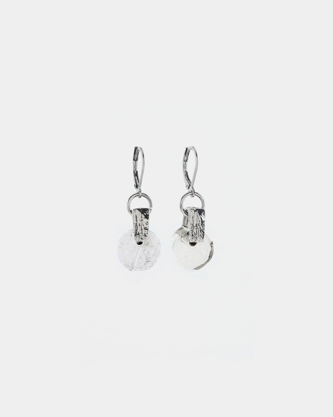Un disque de verre coloré flotte sous une attache en étain texturé, tel un astre en apesanteur. Délicates et mobiles, elles captent chaque mouvement pour diffuser des reflets subtils et profonds.