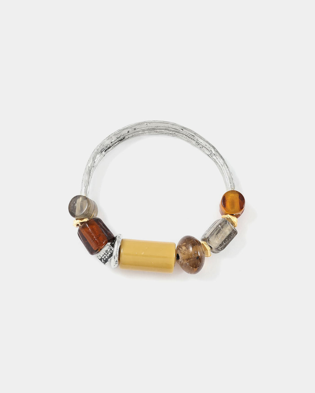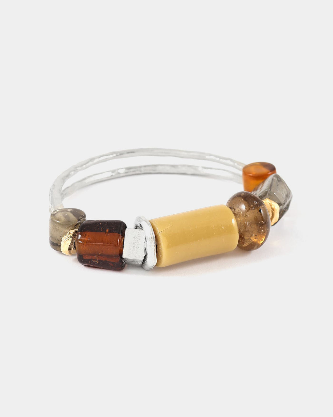 Majoritairement composé de verre coloré et d’étain naturel ou plaqué or 22 carats, il dévoile une composition aux formes et textures contrastées, posées comme des accents précieux. Un bracelet bangle profondément expressif, qui capte la lumière et affirme le poignet avec justesse.