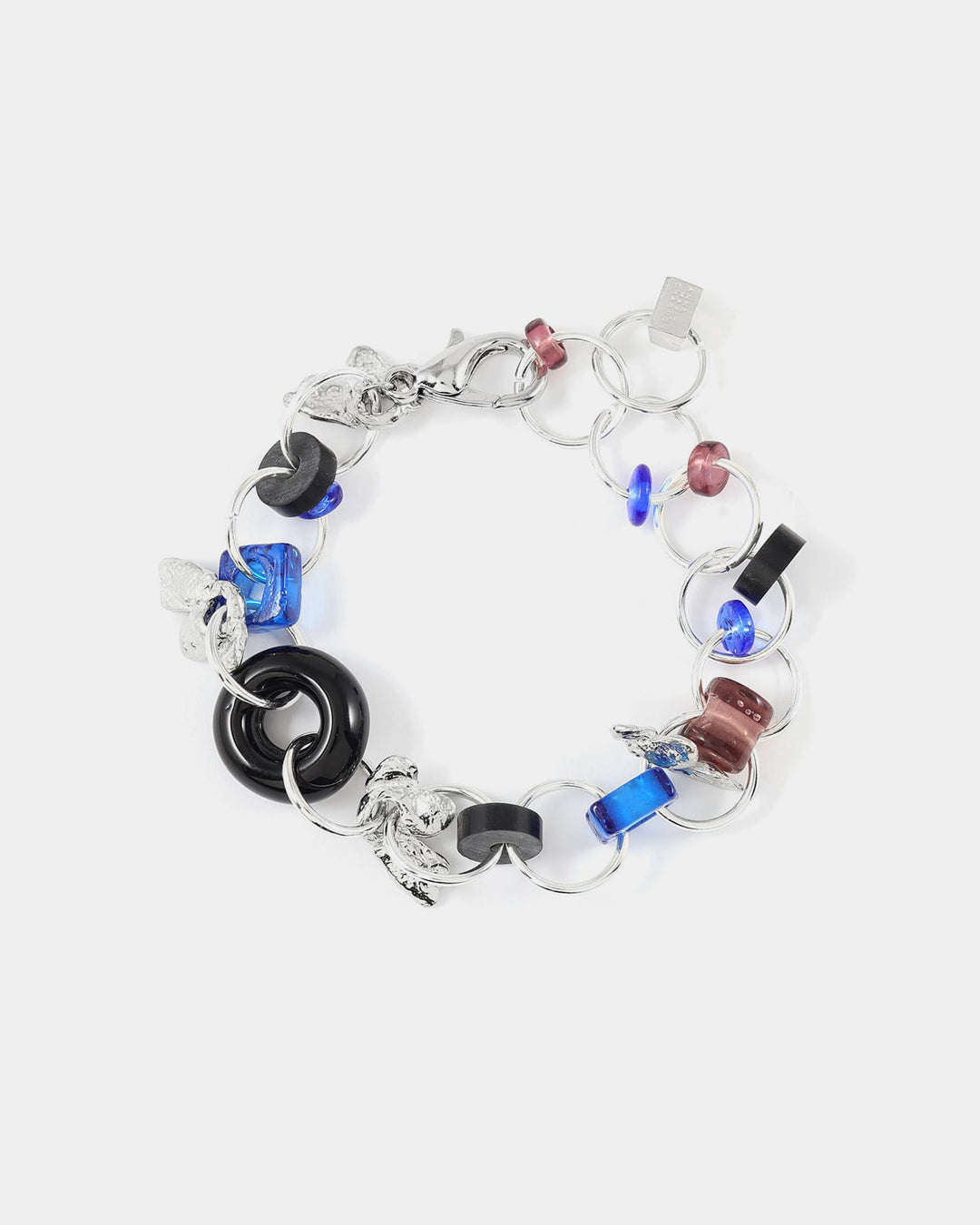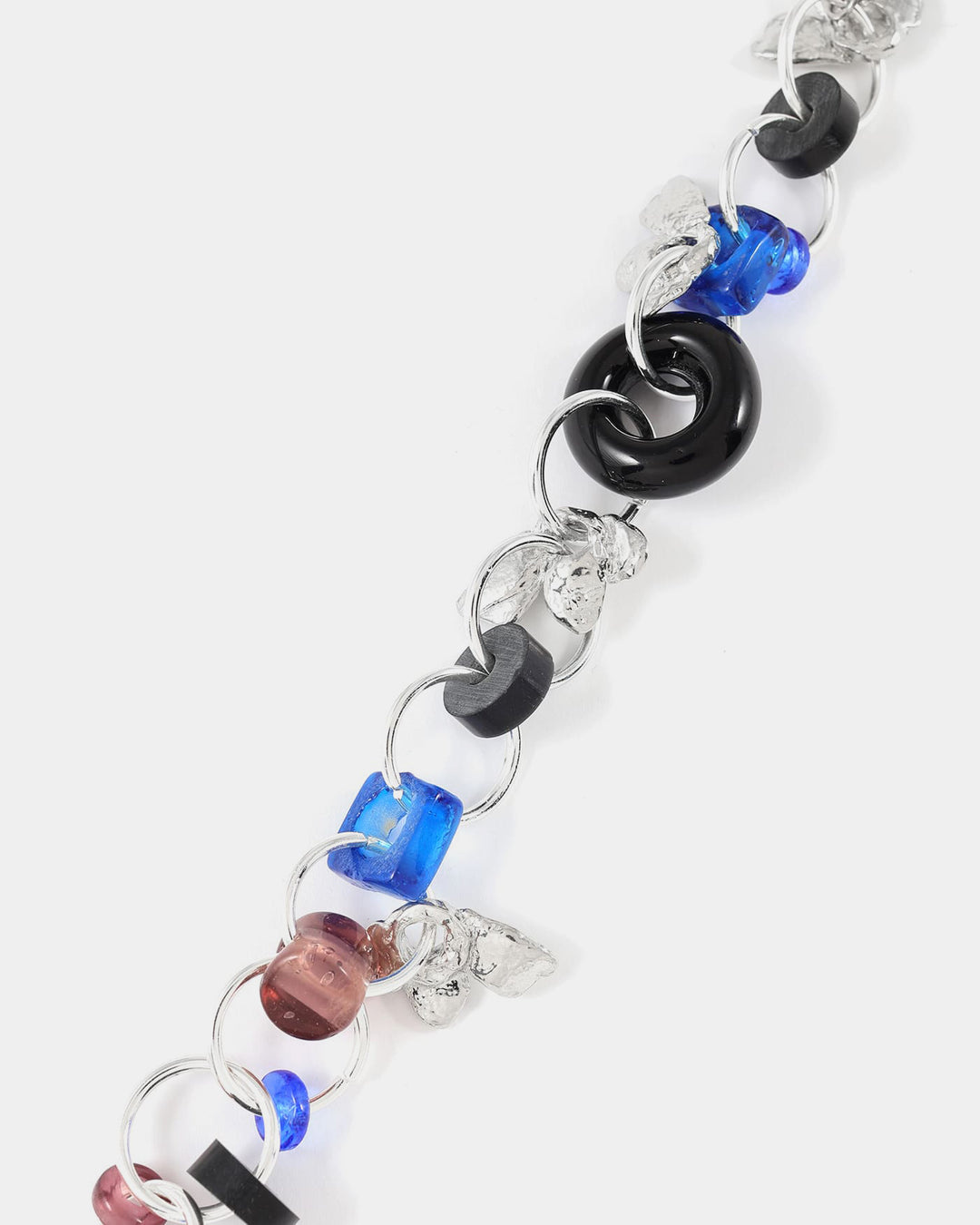 Entre verre lumineux, résine vibrante et pendentifs Félice en étain naturel ou plaqué or 22 carats, chaque élément semble capter et transmettre son propre signal. Ce bijou imposant insuffle du mouvement et de la force à votre style, créant une résonance unique à chaque geste.