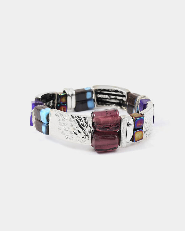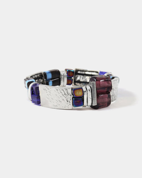 Un enchaînement géométrique d’éléments en étain naturel ou plaqué or 22 carats et de verre coloré, où textures martelées, perles sculptées et médaillons texturés s’imbriquent dans un jeu de contrastes vibrant. Compact mais expressif, ce bracelet capte le regard et accompagne chaque mouvement avec force et relief.