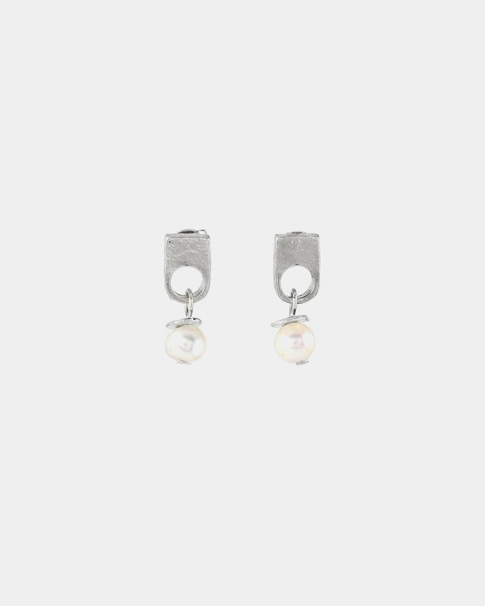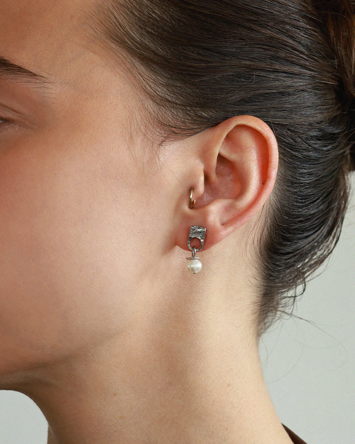 Une perle d’eau douce y flotte en apesanteur, apportant une touche de douceur aérienne. Montées sur une tige en acier inoxydable hypoallergénique, ces puces à la structure graphique rencontrent l’élégance des courbes fines.