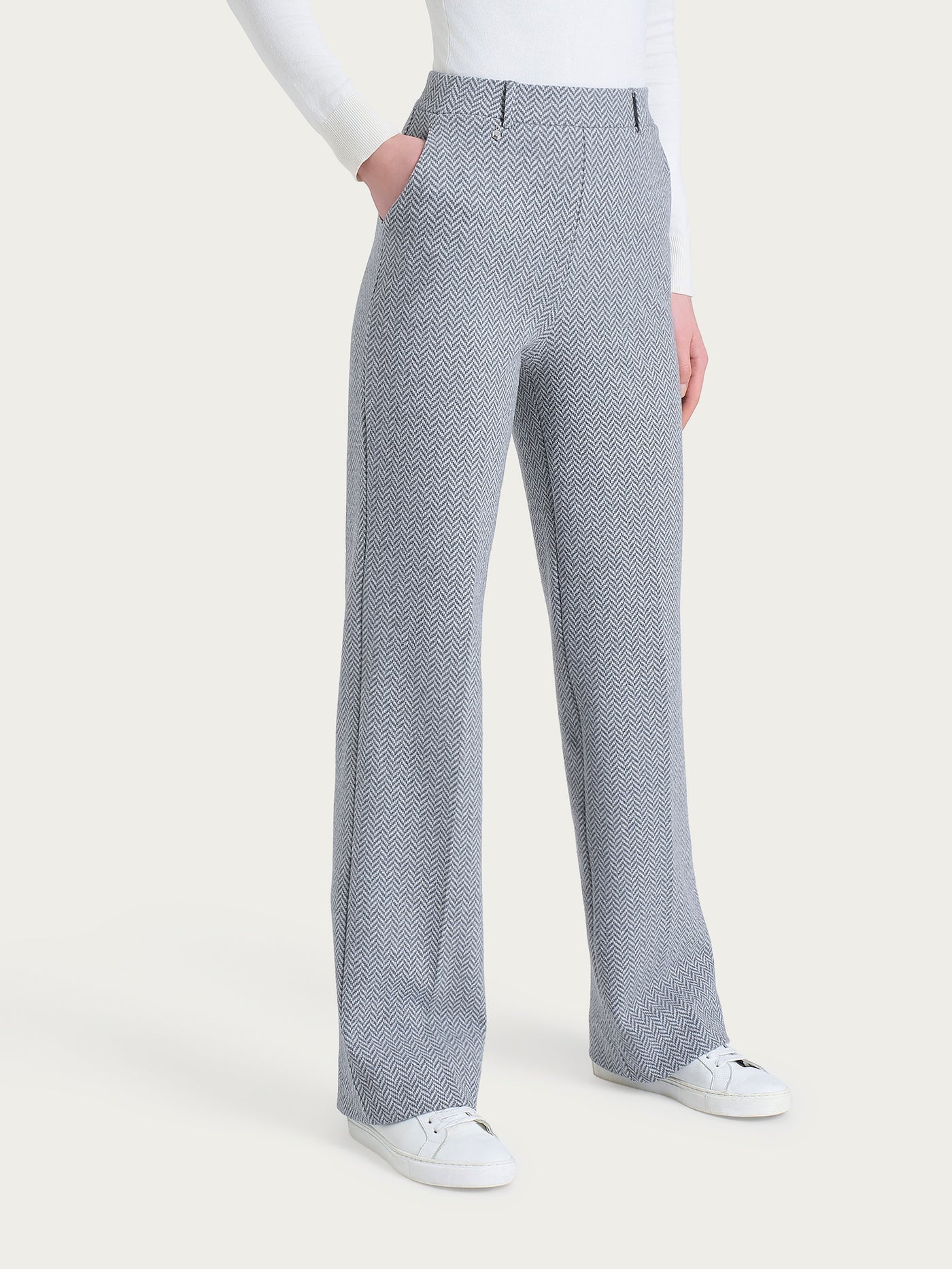 Confectionné en Eco Jacquard, un point Milano extensible qui allie la stabilité des tissus à navette à la souplesse des pulls, permettant la création d'élégants motifs teints en fil grâce au tissage jacquard.